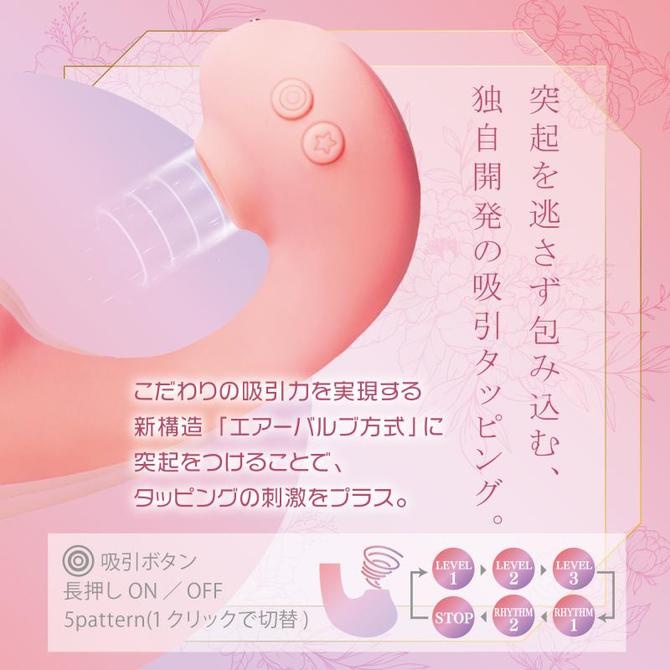 反対側の吸引部分には、クリをターゲットにした極小の穴径を採用しています。内部には突起があり、これがタッピングするように細かく動作します。吸引による刺激に加えて物理的な刺激も同時に与えることで、これまでにない重層的な快感を生み出します。こだわりの吸引力を実現する新構造「エアーバルブ方式」により、繊細でありながら確かな刺激を味わえます。